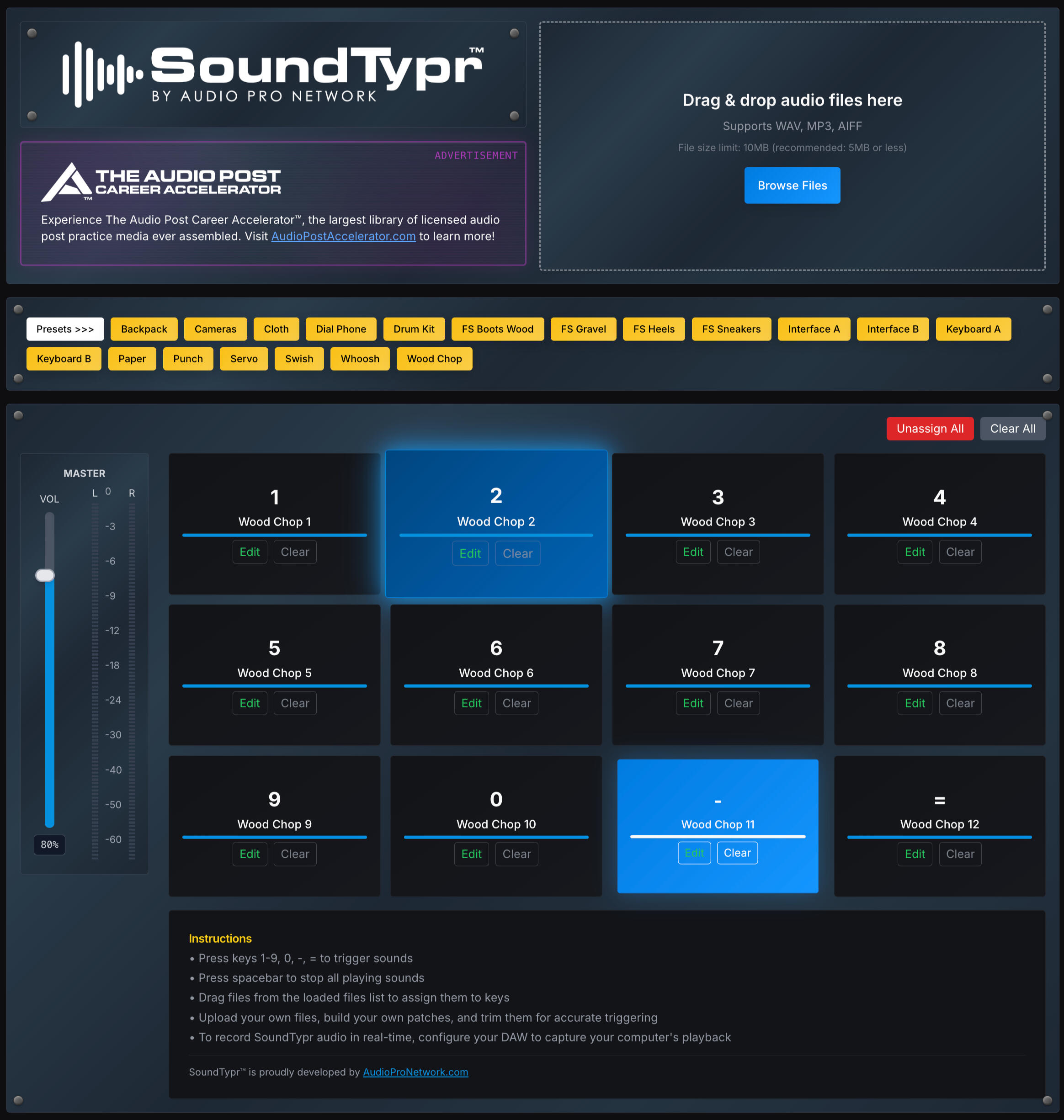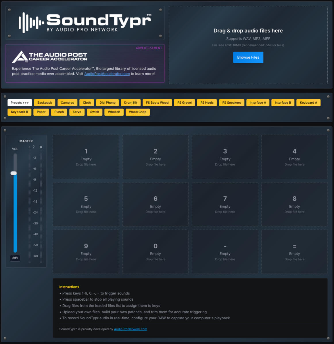 SoundTypr™ is a free, browser-based sound triggering tool developed by AudioProNetwork.com. Designed for quick and intuitive sound triggering directly into your DAW, it’s perfect for short sound effects like footsteps, impacts, or interface sounds.Built with accessibility in mind, SoundTypr™ is especially useful for those just starting out who may not yet have access to professional tools.While SoundTypr™ is powerful on its own, it’s even more effective when paired with our virtual audio post apprenticeship, The Audio Post Career Accelerator. Together, they give emerging talent both the tools and the mentorship needed to build a professional audio post portfolio and break into the industry.